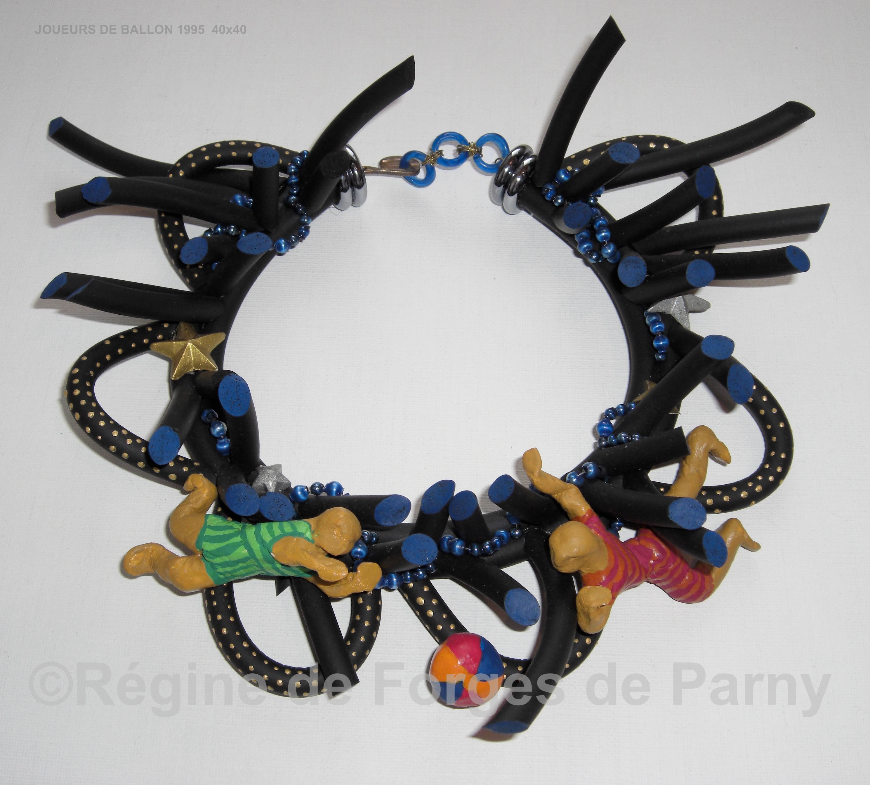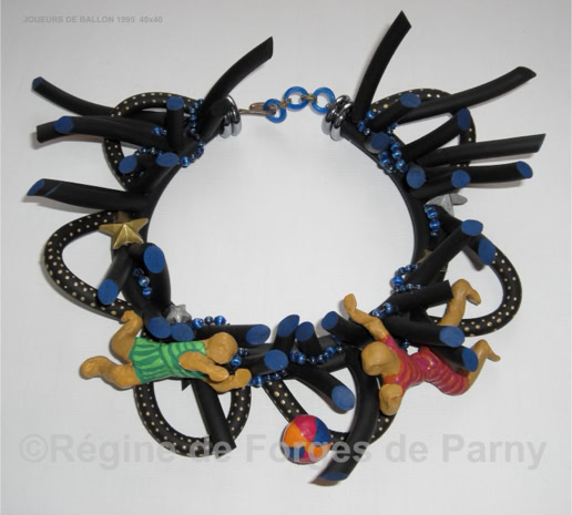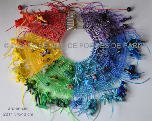 Collier plastron constellé de jouets colorés, super-héros de l'enfance. Ils parcourent les ondulations aux couleurs magiques