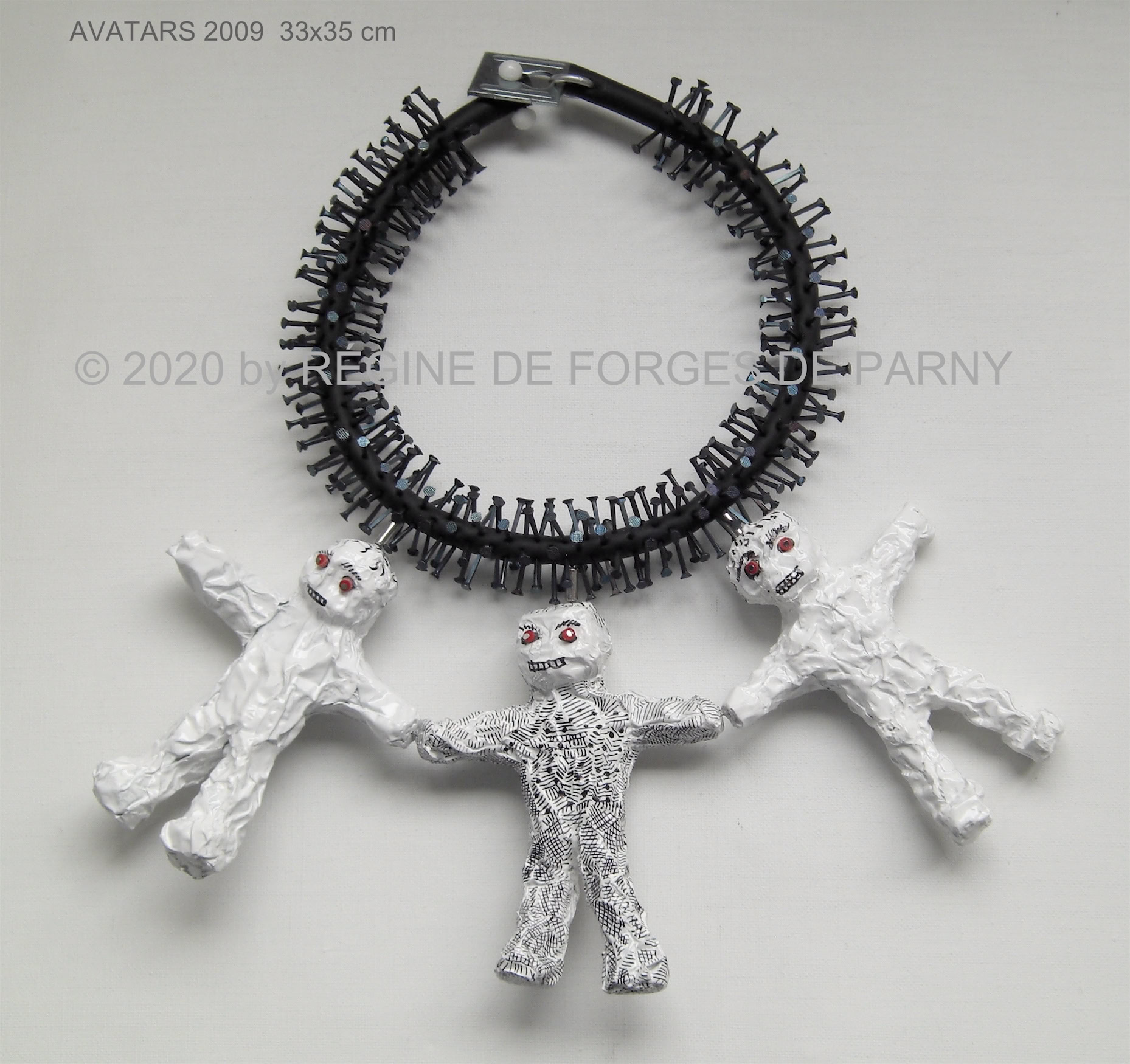 Trois petits personnages symbolisent les trois MOI ; ils se tiennent par la main car ils sont indissociables : le MOI, le ÇA et le SURMOI forment un trio infernal, il faut beaucoup, beaucoup de clous